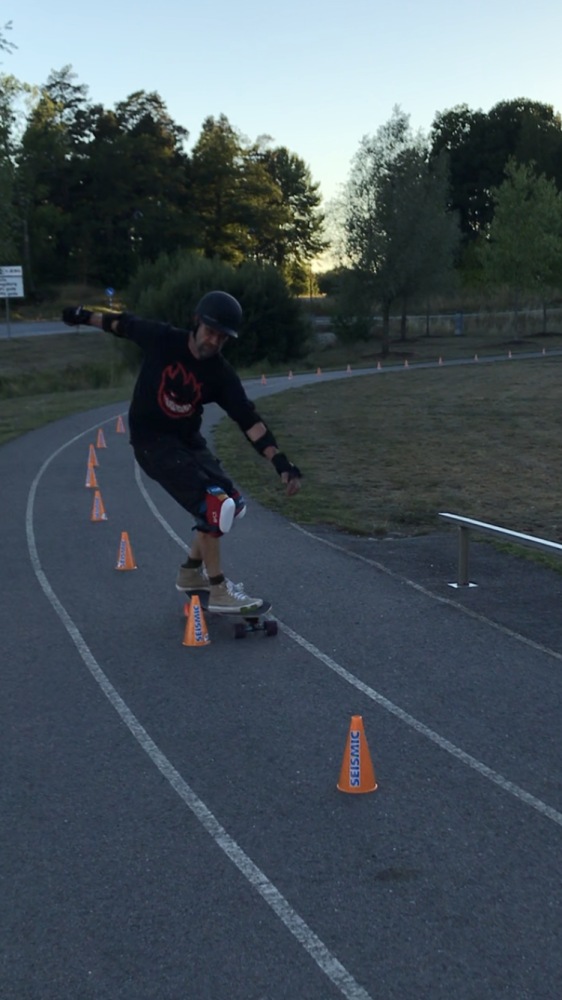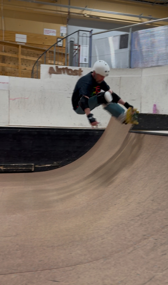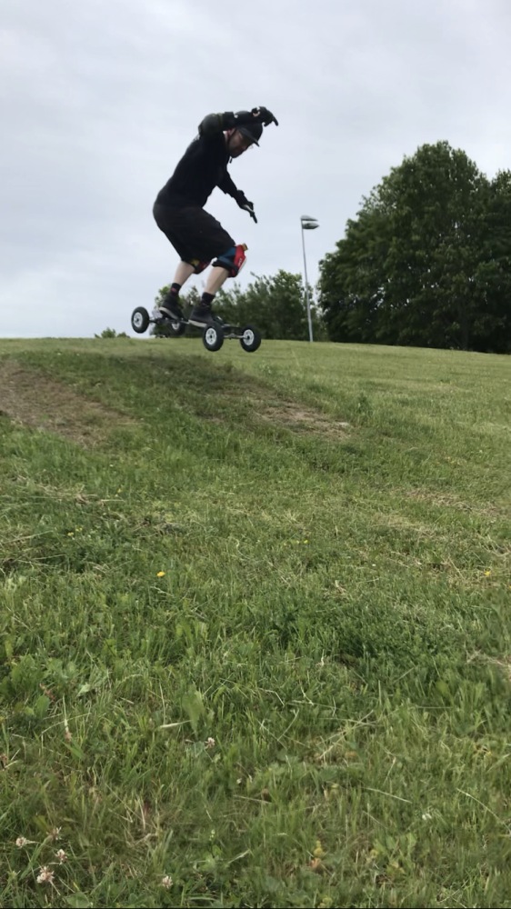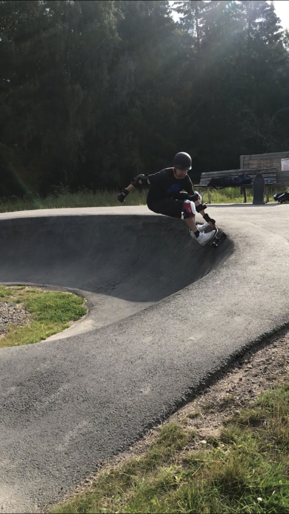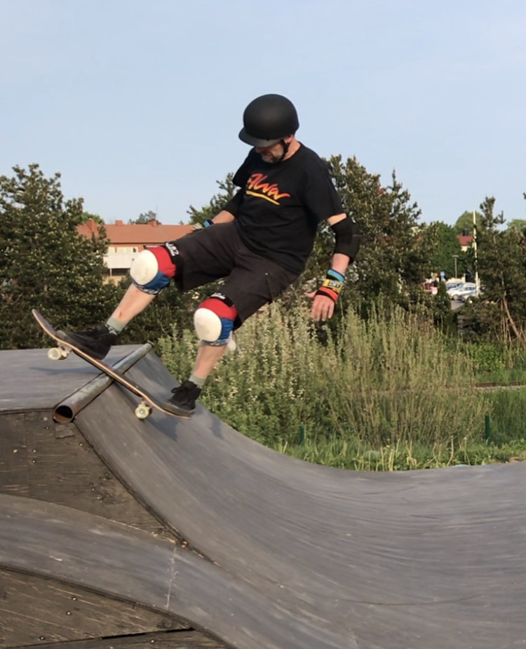The picture above is a frontside air in February 2025 (Hangaren skatepark). The next is a "double finger flip" dating september 2020 (Photo Erik Solie), the following a 50/50 over the hip at Hangaren skatepark in Linköping September 2023 (Photo Brad Fridell). Then at Rimforsa mini-ramp rock to fakie in May 2023, then slalom skateboarding August 2022 and finally surfskating pump track in August 2021. Snowboard, snowskate and ice-blade skateboarding are occasionally practiced during winter times. He also has a mountainboard: